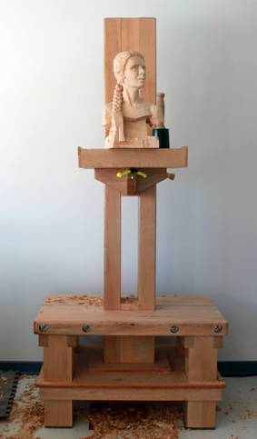 People have asked me about my carving bench. Many years ago I took a carving seminar and I used a similar bench and liked it a lot and got out my tape measure and took some measurements and when I got home drew up some plans. The tail-vice screw, clamps the table in place. The table can move up and down a total of 38 inches, but I usually only move it around15 inches. Sometimes it is difficult to raise it due to the weight. I am just to lazy to take the carving and clamps off. The bench is made of maple. The base top has 13 pieces of wood sandwiched together by four 1/2 inch threaded rods with nuts and washers at each end. The bench I copied had a 4 foot by 4 foot base, but my work shop in my basement was too small for such a large base so I made it 2-1/2 feet by 3 feet.