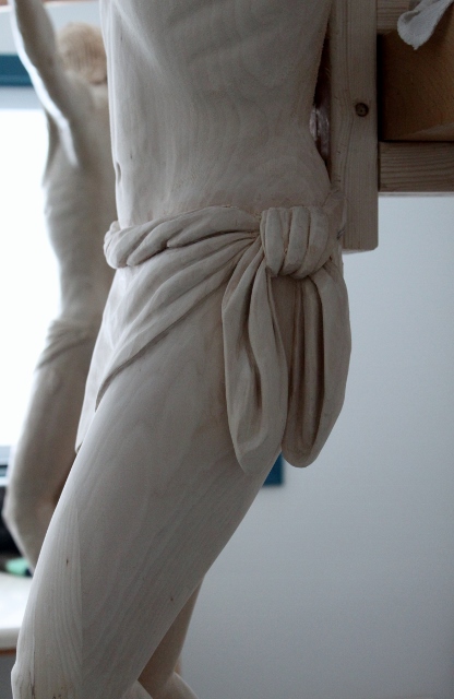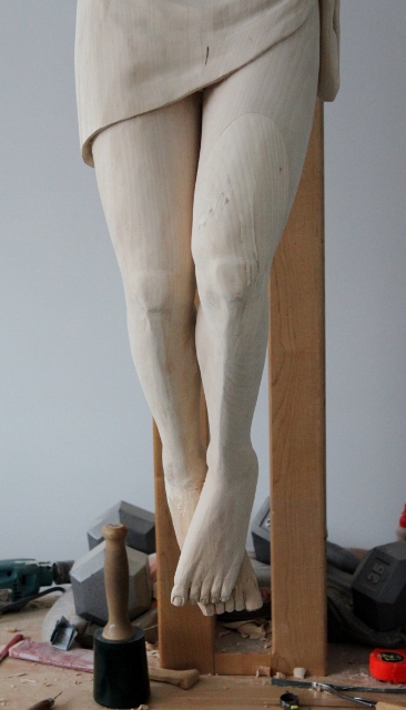I have been working a lot on the legs and feet. The first picture you can see my bench that I started using. It is platform that I made when I was sculpting the crucifix out of clay and now it is a handy bench to sit on while I carve on the feet and long enough to put some of my tools on.
